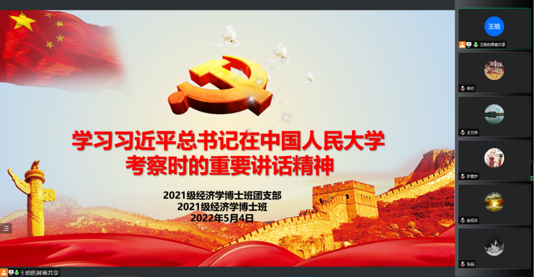 学习习总书记考察新葡京官方 讲话精神,做新时代有为青年。5月7日,新葡京官方 以“学习习近平总书记在中国人民大学考察时的重要讲话精神”为主题的集体学习团课在线上顺利召开。新葡京官方 党委副书记李佩洁老师带领大家深入回顾学习有关讲话精神,参与习总书记来校考察当日现场活动的陈诚、高家鎏、雷淏文、赵倚仟、何佳妮同学受邀与同学们分享自己的难忘经历与心得体会。