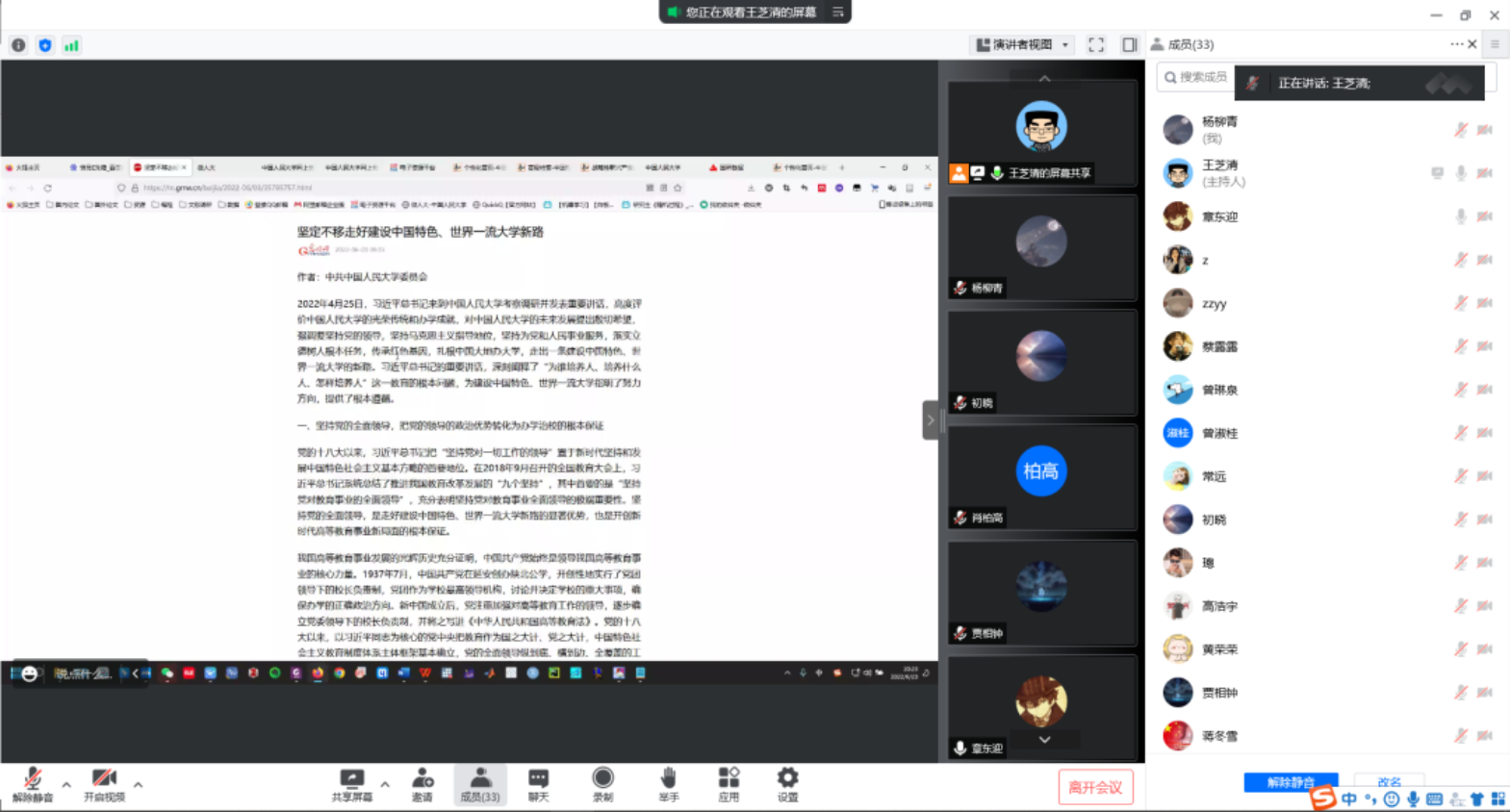 6月23日,为深入学习习近平总书记考察中国人民大学重要讲话精神,学习贯彻落实党的教育方针,世界经济博士党支部通过腾讯会议线上开展“贯彻党的教育方针,走中国特色高等教育道路”主题党日活动。本次会议由世界经济博士党支部书记王芝清主持,支部成员参会。