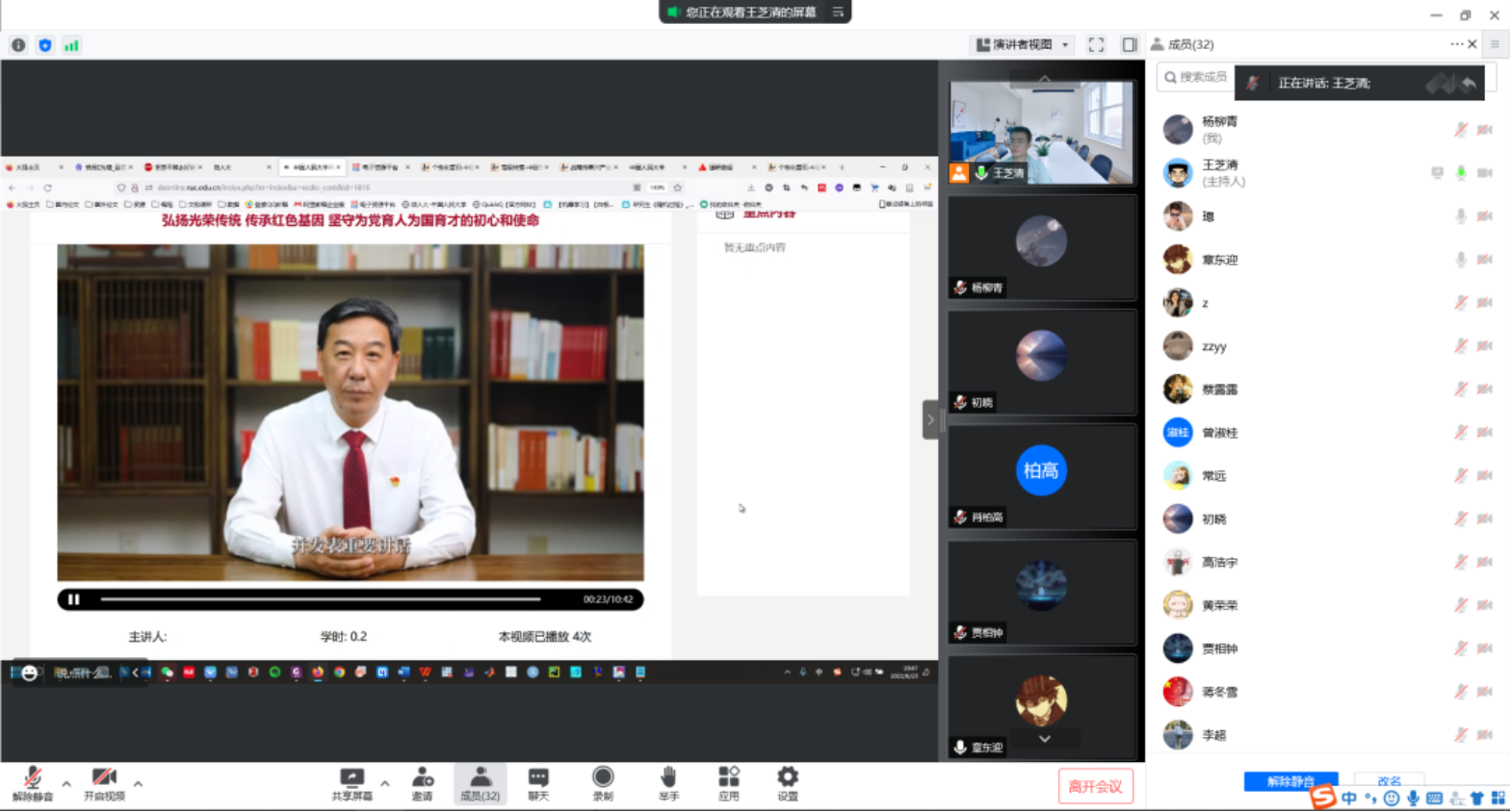 全体支部成员集体观看中国人民大学党委书记张东刚主讲课程《弘扬光荣传统 传承红色基因 坚守为党育人为国育才的初心和使命》。张东刚书记回顾了中国高等教育的发展历程,深入浅出地讲解了红色基因对于中国高等教育发展的极端重要性,指出中国高等教育重视思想理论课程建设,扎根中国大地,走出一条中国特色的高等教育道路。
