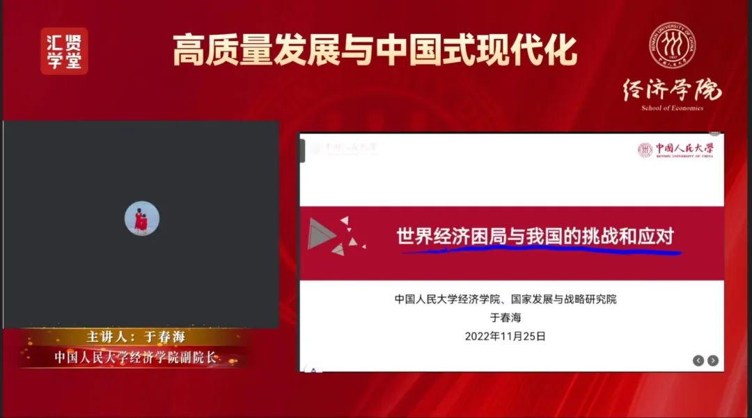 2022年11月25日,以“世界经济困局与我国的应对和挑战”为主题的形势与政策研讨课顺利开展。本次研讨课由新葡京官方 于春海教授主讲,同学们通过线上的方式观看学习。