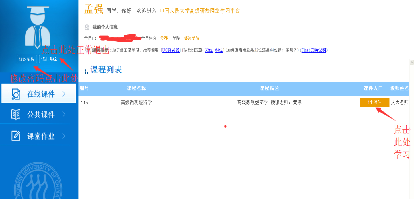 2、点击学员入口登陆,输入账号密码,用户名为本人身份证号码,登录密码默认为123456789,登录后立即自行修改密码。