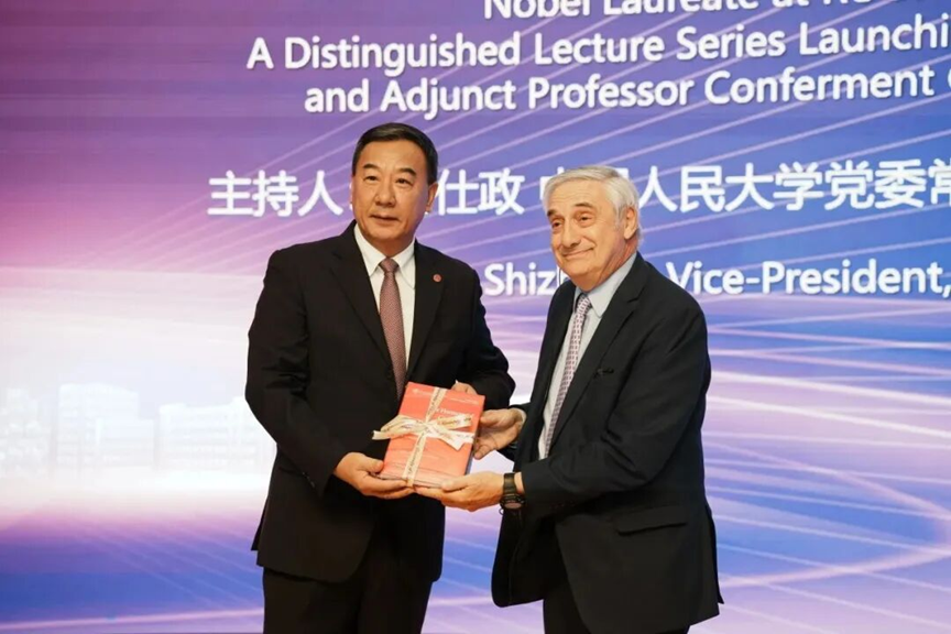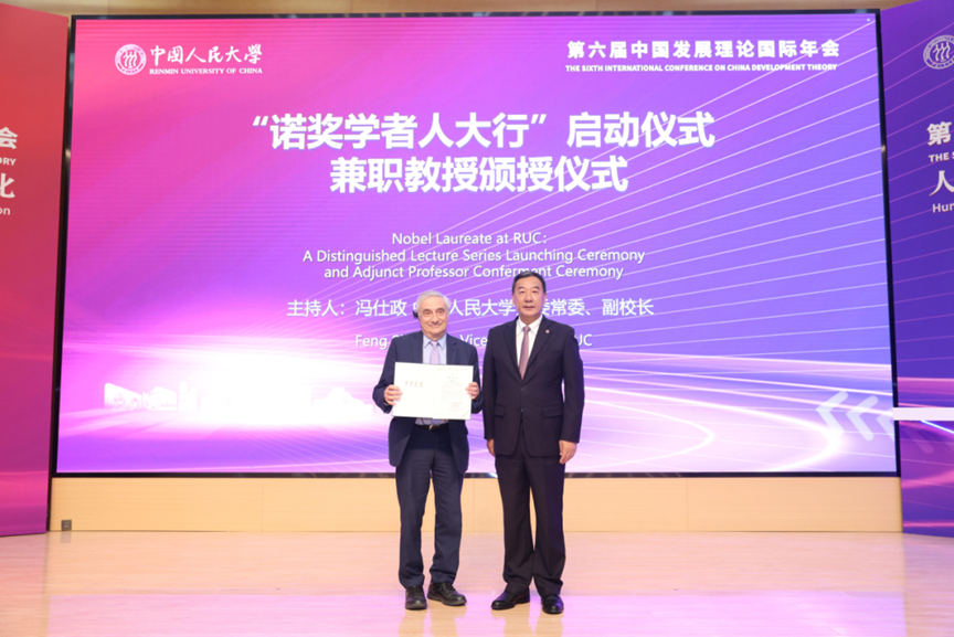 10月25日,近400位中外知名学者和学生齐聚中国人民大学,以“人文经济与中国式现代化”为主题,隆重举行第六届“中国发展理论”国际年会,共谋“十五五”时期中国和全球经济发展中的重大议题,会上学校举办“诺奖学者新葡京官方 行”启动仪式,中国人民大学党委书记张东刚为乔尔·莫基尔颁发兼职教授聘书,并赠送中国人民大学“文明新形态‘两史两论’丛书”。中国人民大学副校长冯仕政主持。
